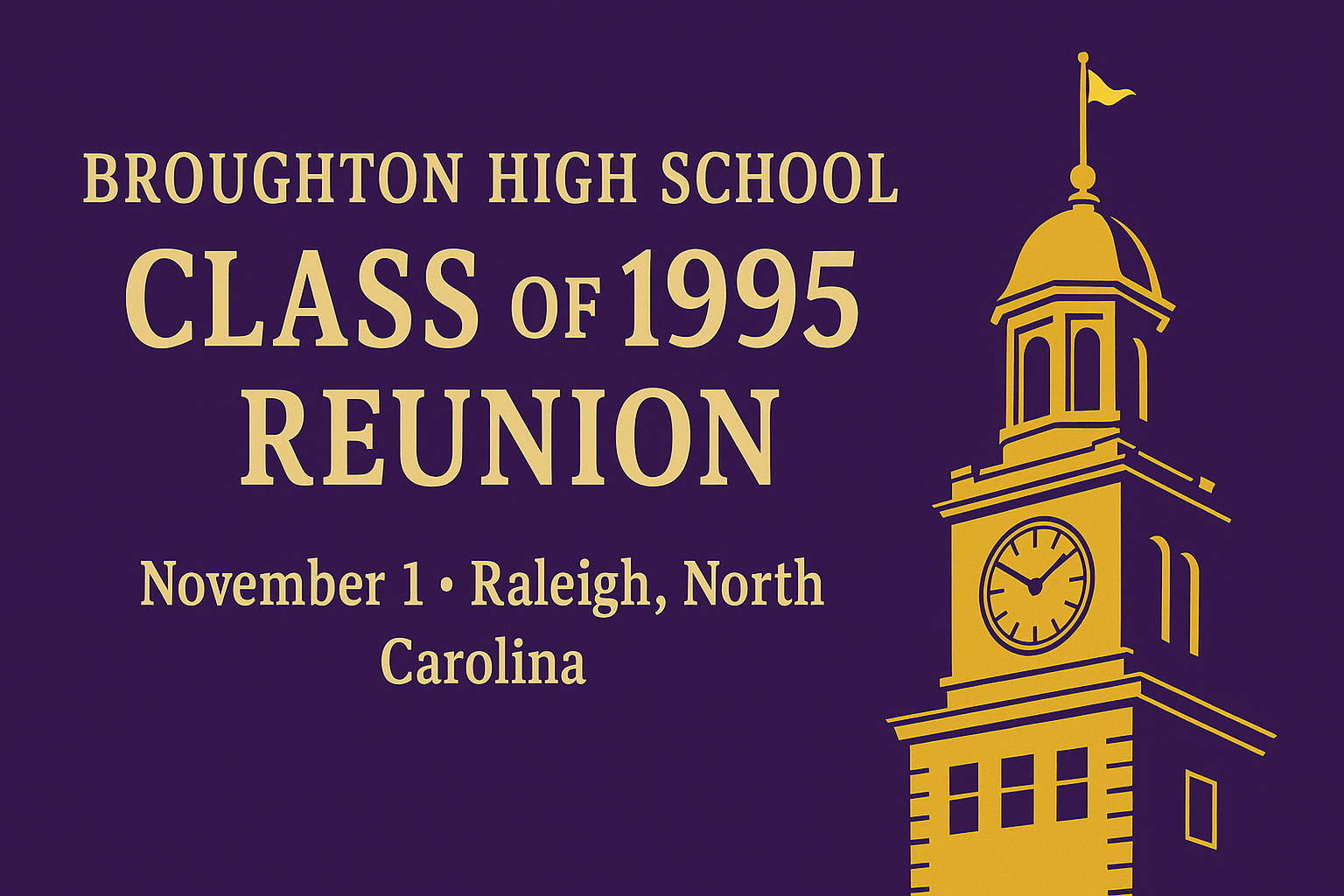 The Broughton High School Class of 1995 is excited to announce our upcoming reunion on November 1st at the City of Raleigh Museum! We can’t wait to reconnect, reminisce, and celebrate together. Please be sure to RSVP and purchase your tickets as soon as they become available so we can plan for a great evening. We also encourage everyone to RSVP and update their contact information using the reunion form to make sure you don’t miss any updates. Don’t wait—secure your spot and join us for an unforgettable night with classmates and friends!
